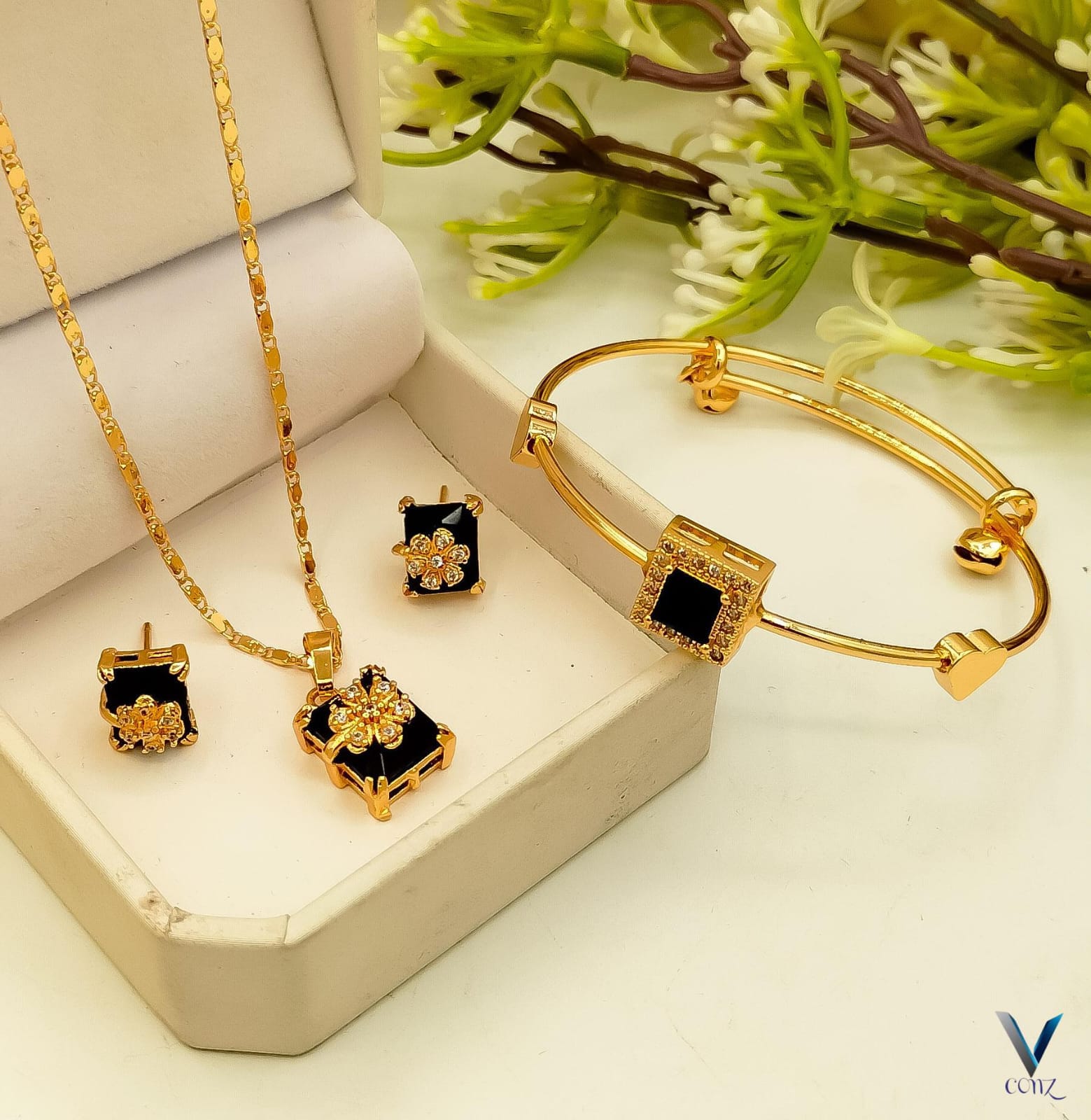 Experience the elegance and allure of the Gold Zarqon set. Crafted with China's finest gold and adorned with a striking black color, this set exudes a captivating charm. Perfect for any occasion, this set is guaranteed to turn heads and elevate your style.